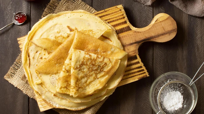- Сковороду хорошо разогрейте, налейте блинное тесто (сковороду маслом не смазывайте), распределите по всей поверхности и обжарьте с двух сторон до золотистого цвета.
