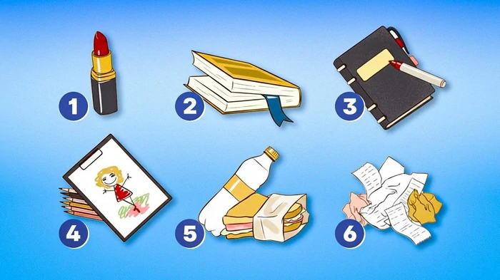 Выберите на картинке одну вещь - помаду, книгу, ежедневник, канцелярские принадлежности, еду и напитки или другие ненужные мелочи (чеки, обертки и т.д.) - которую всегда можно найти в вашей сумке. Читайте ниже, что этот выбор говорит о вас.