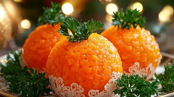 - Готовой закуске необходимо дать остыть в холодильнике в течение 30-40 минут для стабилизации формы. Вкус таких мандаринов — это нежное сочетание ветчины, сыра и яиц с легкой сладковатой ноткой моркови, что делает блюдо настоящим хитом.