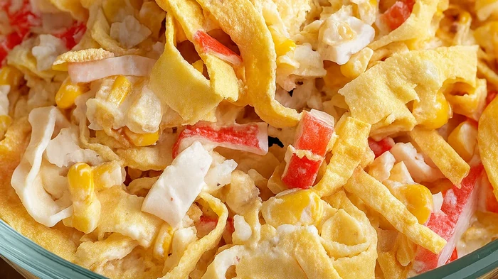 Блюдо уже успело собрать много просмотров в соцсетях. Нежная текстура яичного блина, сладость кукурузы, прохладный, уже охлажденный рис и сочные крабовые палочки создают идеальный баланс. Это салат, который «просится» и на семейный обед, и на праздничный стол, и в коробку для ланча.