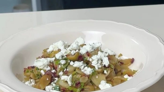 - На сковородке обжарьте лук с чесноком, добавьте листья, оливки, соль, перец, щепотку сахара и немного лимонного сока.