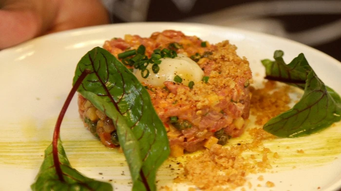 Тартар — это блюдо из мелко нарезанного мяса или рыбы с пикантной заправкой. В нашей версии — оригинальный вариант на основе сыровяленой колбасы. Она имеет насыщенный вкус и приятную текстуру, которая идеально подходит для такой подачи.