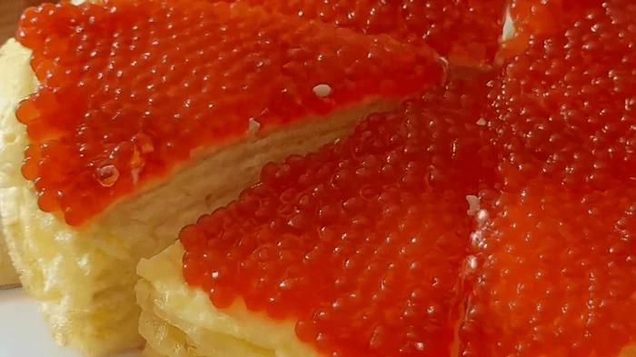 Это торт из яичных блинов без муки, с нежной сырной начинкой и яркой «икорной» шапкой, выглядит эффектно, будто его только что принесли из премиального ресторана на побережье.