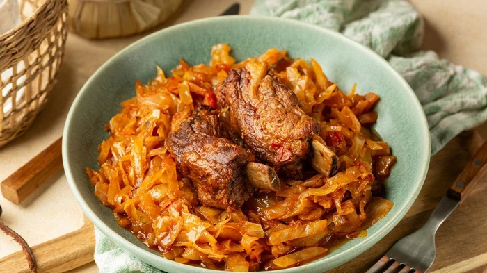 Если тушеная капуста со свиными ребрами получается суховатой, добавьте еще 100-120 мл горячей воды.