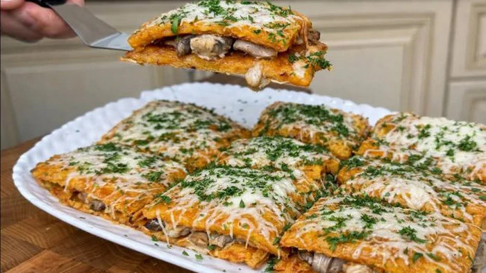 - Корж нарежьте на небольшие части и выложите начинку и сверху накройте другой частью коржа. Сверху посыпьте натертым сыром и поставьте в духовку, чтобы расплавился сыр.