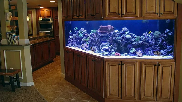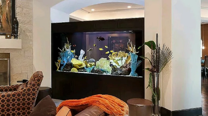 Оригинальным решением будет аквариум-перегородка, который разделяет комнату на зоны, добавляя интерьеру современности. Также популярны варианты в виде столика или барной стойки - это не только функционально, но и стильно. Встроенные аквариумы внутри мебели или стен позволяют создать эффектные дизайнерские решения.